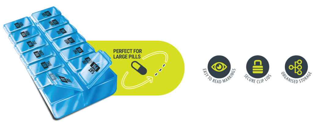 The VitaPlus One Week Pill Box includes 14 compartments, conveniently separating morning and evening doses for each day of the week. With its secure clip-on lids, it offers an ideal solution for neatly organized pill storage.